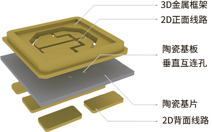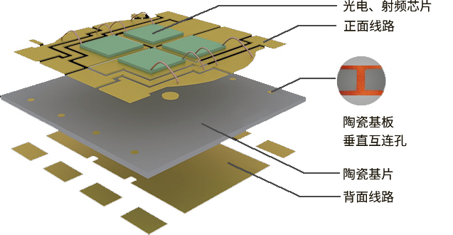 薄膜電路陶瓷封裝基板是一種通過磁控濺射薄膜金屬化與電鍍制程的技術:即根據應用需要,在高導熱的陶瓷基體上,采用薄膜金屬化及影像轉移方式制作2D金屬線路,然后采用TCV(Through Ceramic Via) 技術形成雙面布線間的垂直互連,最后采用堆疊技術獲得與陶瓷基體結合緊密的一體式3D金屬框架?;诒∧る娐饭に?,通過磁控濺射實現陶瓷表面金屬化,通過電鍍實現銅層和金成的厚度大于10微米以上即DPC(DirectPlateCopper-直接鍍銅基板)。